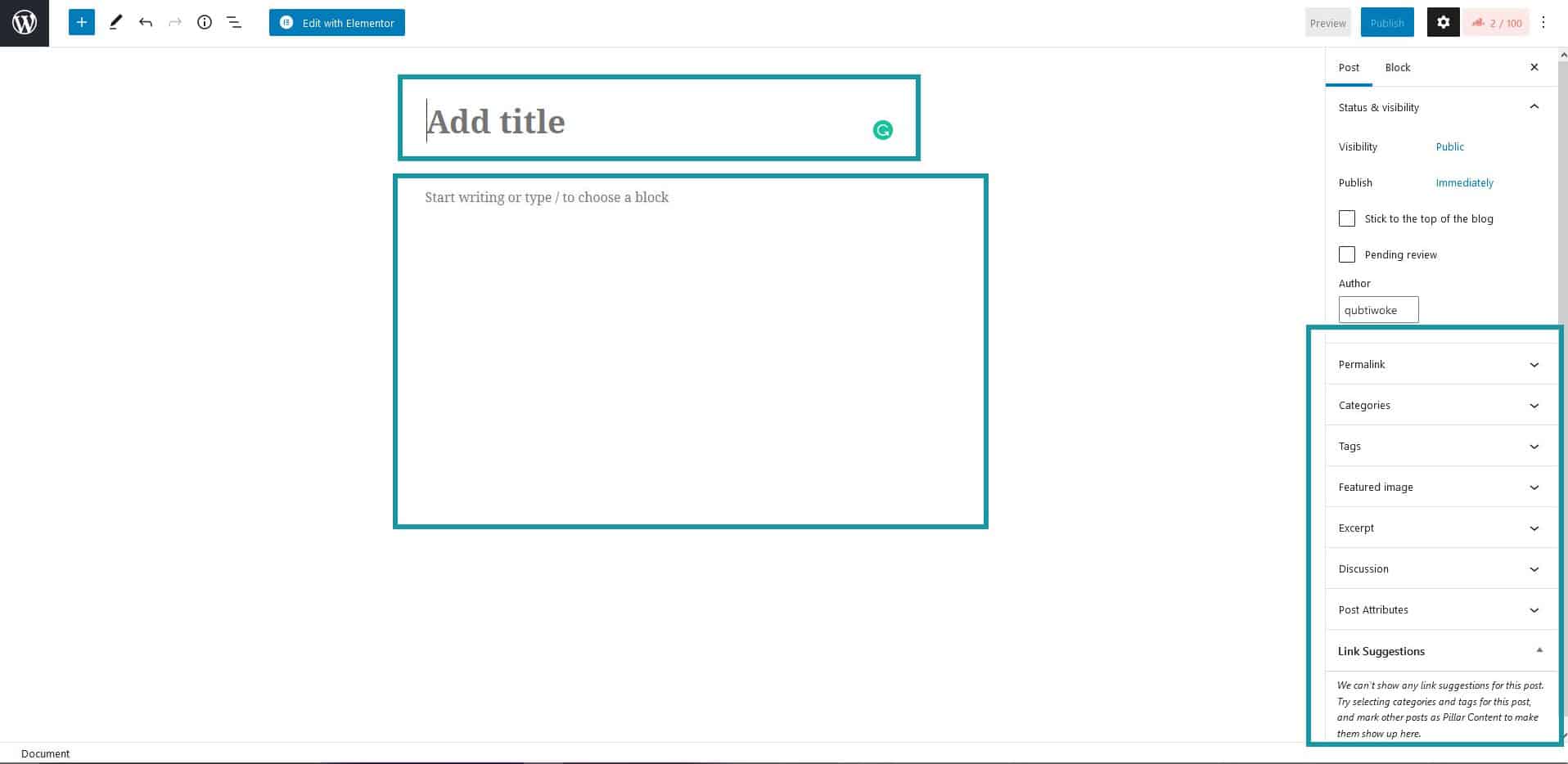 If you are going to create your blog post using Elementor then once ready to start you will click on “Edit With Elementor“, if not you can write your articles using either the visual (WYSIWYG) editor or the text view.