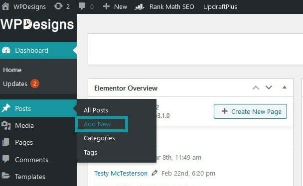 The Dashboard is where you go to do many things in WordPress, but you will need to navigate here to add your new post. Add /wp-admin to your website URL to get there if you don’t know-how.